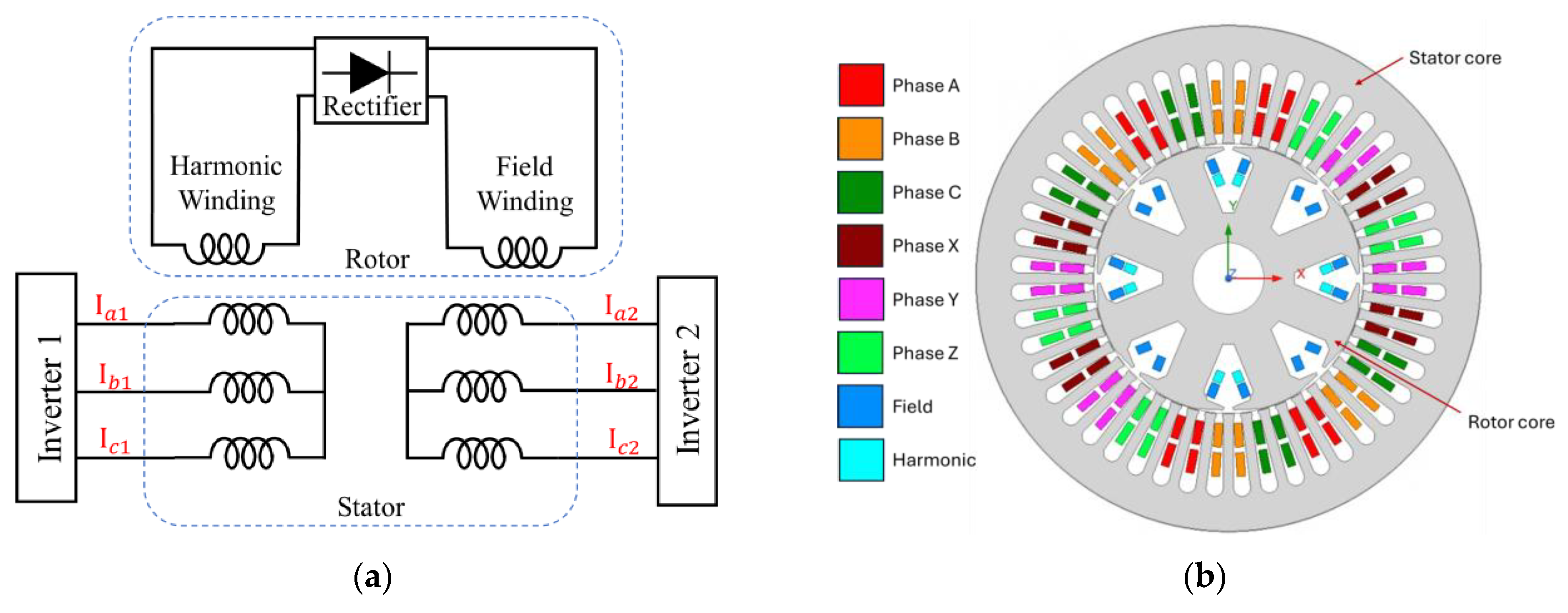 - Sirewal, G.J.; Kim, E.; Choi, G. Dual Inverter Controlled Third Harmonic Current Injection Scheme for an Open-End Winding Brushless Wound Rotor Synchronous Machine. In Proceedings of the 2024 27th International Conference on Electrical Machines and Systems (ICEMS), Fukuoka, Japan, 26–29 November 2024; pp. 3374–3380. [Google Scholar] [CrossRef]