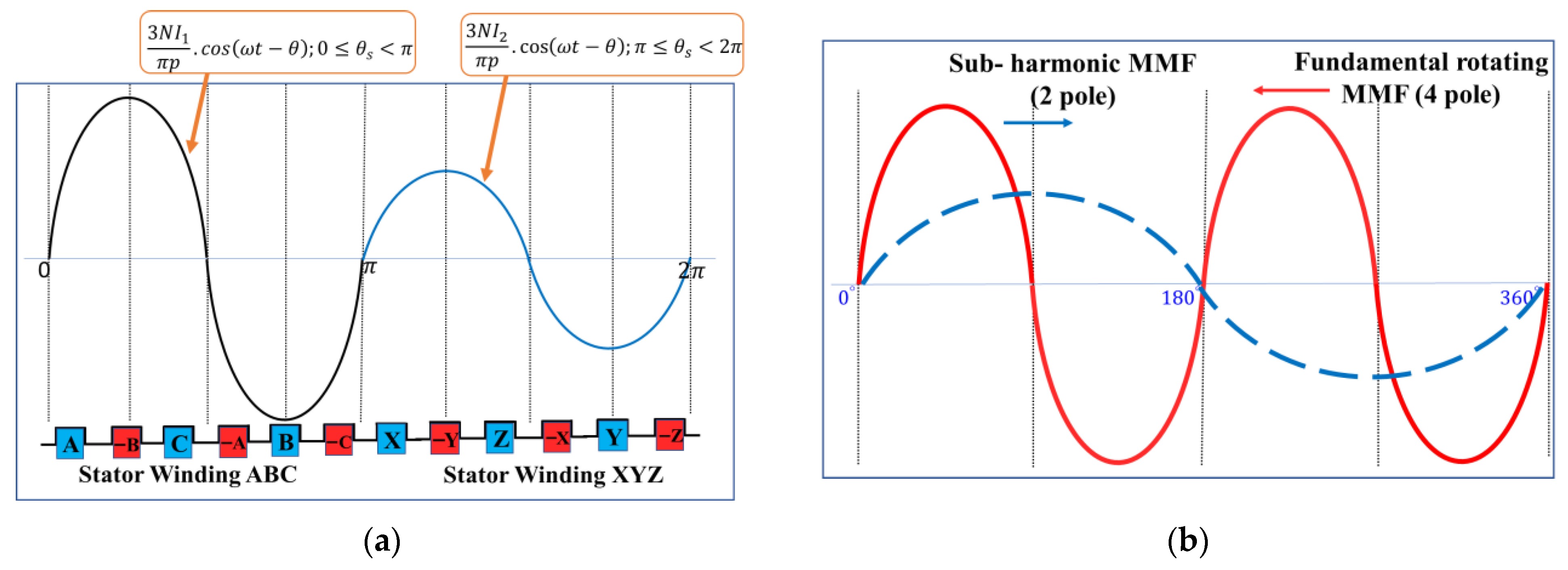 - Chung, J.; Hofmann, H. Brushless Self-Excited Synchronous Field-Winding Machine with Five- and Higher-Phase Design Using Independently Controlled Spatial Harmonics. IEEE Trans. Energy Convers. 2024, 39, 533–543. [Google Scholar] [CrossRef]