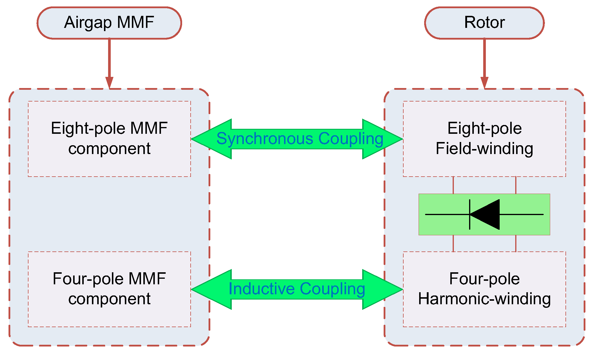 - Cui, S.; Zhang, Y.; Song, B.; Gao, X.; Zhao, T.; Dong, S. Resonant Coupled Excitation Brushless Synchronous Motor. In Proceedings of the 2023 26th International Conference on Electrical Machines and Systems (ICEMS), Zhuhai, China, 5–8 November 2023. [Google Scholar] [CrossRef]