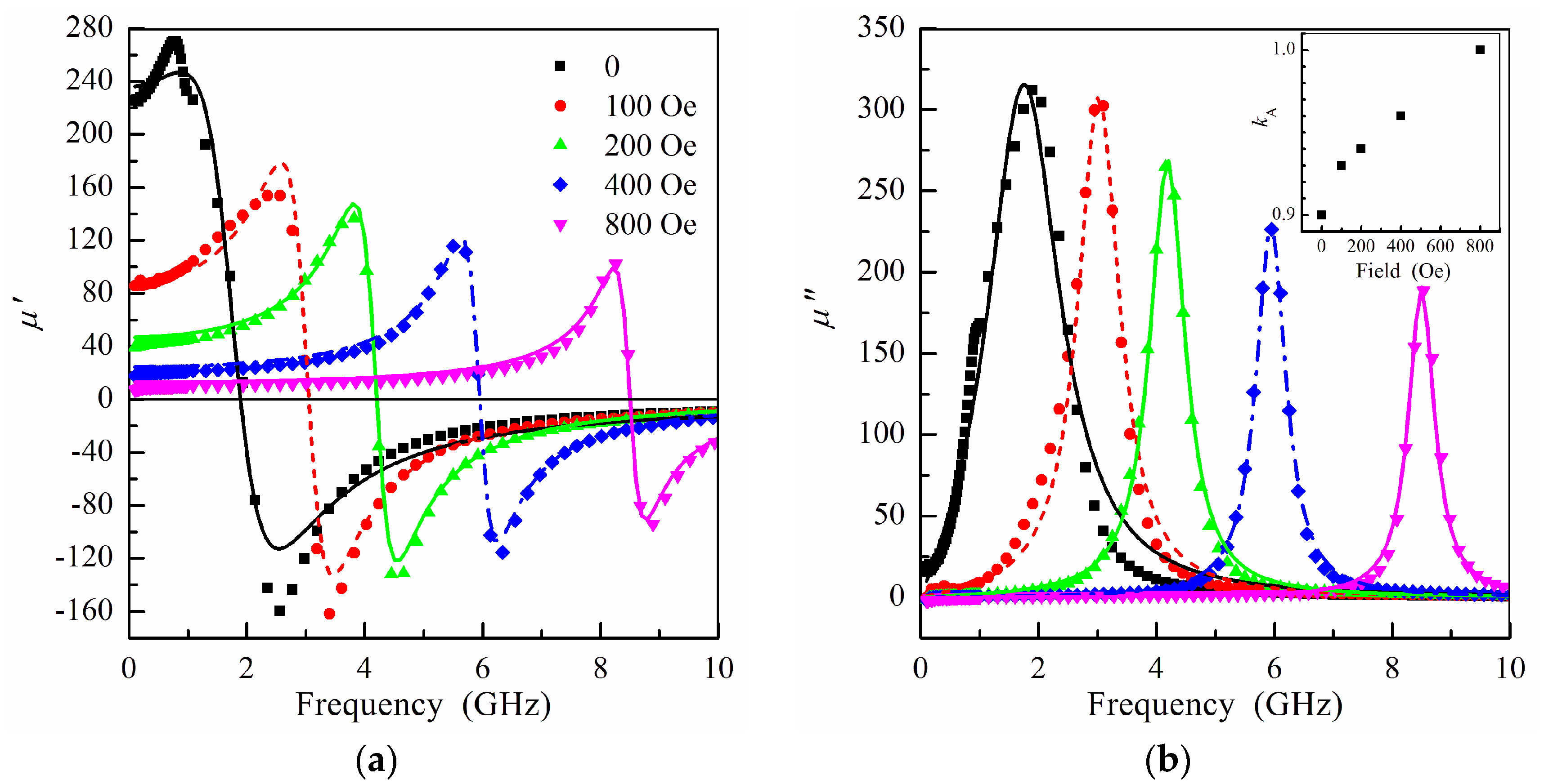 - Liu, B.; Yang, Y.; Tang, D.; Zhang, B.; Lu, M.; Lu, H.; Shi, Y. Research on double resonance peaks and abnormal frequency shift in permeability spectra of annealed FeCoB films. J. Magn. Magn. Mater. 2011, 323, 375–378. [Google Scholar] [CrossRef]