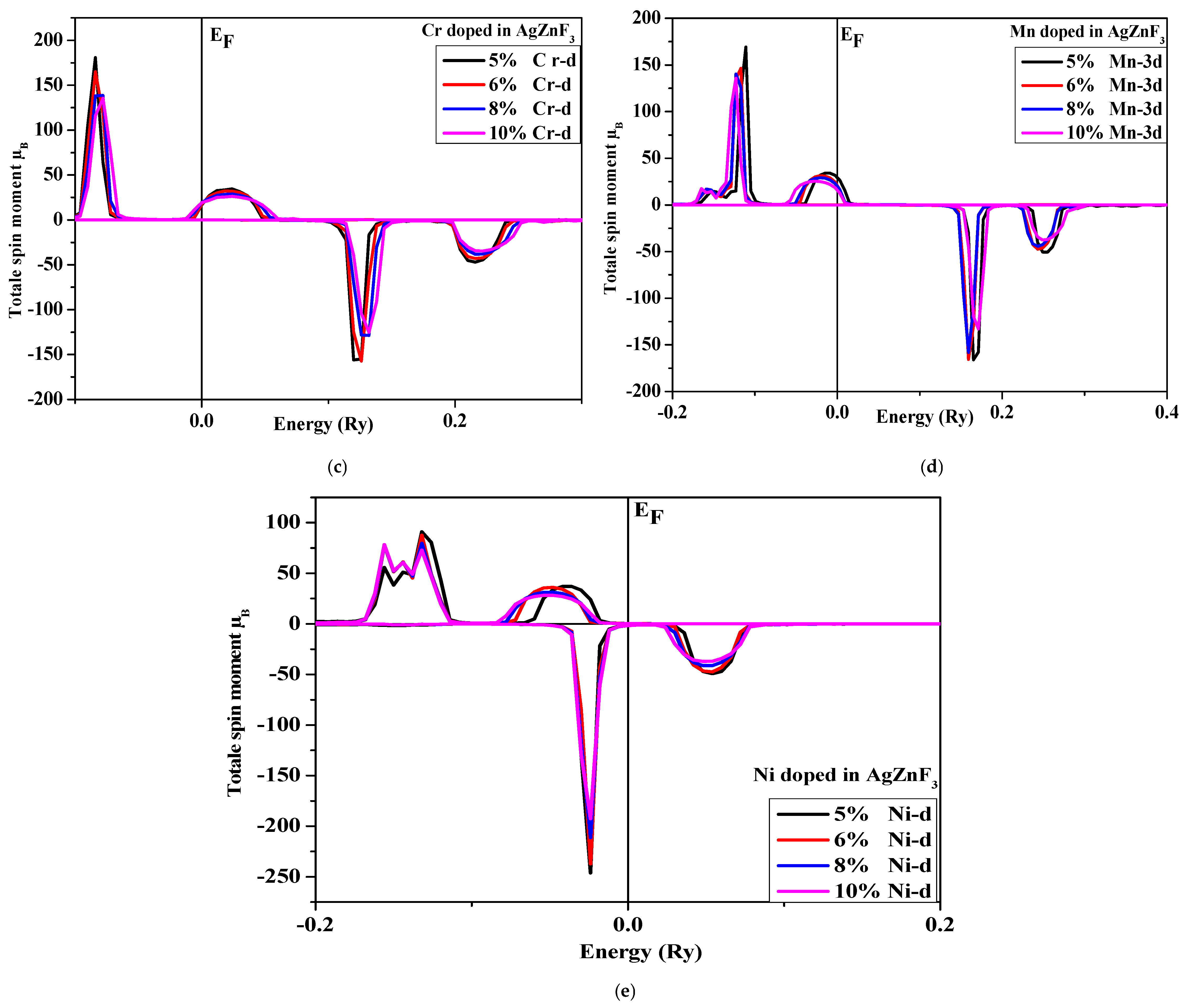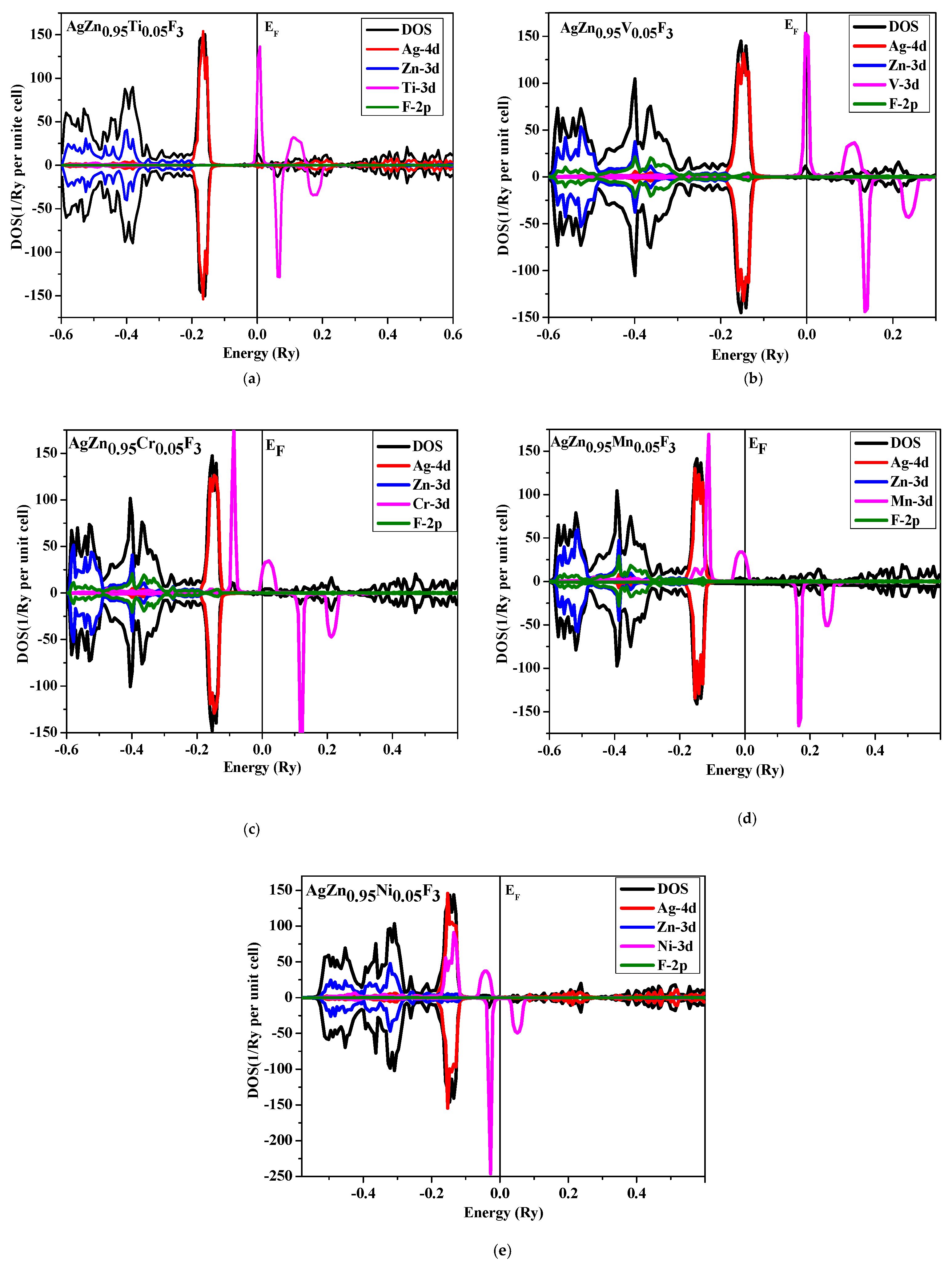 - Koufi, A.; Ziat, Y.; Belkhanchi, H.; Zarhri, Z. Effect of (V, Cr, Mn, Ni, and Cu) doping on the electronic structure and magnetic properties of perovskite RbZnF3 alloy: A DFT study. Europ. Phys. J. App Physics. 2025, 100, 9. [Google Scholar] [CrossRef]