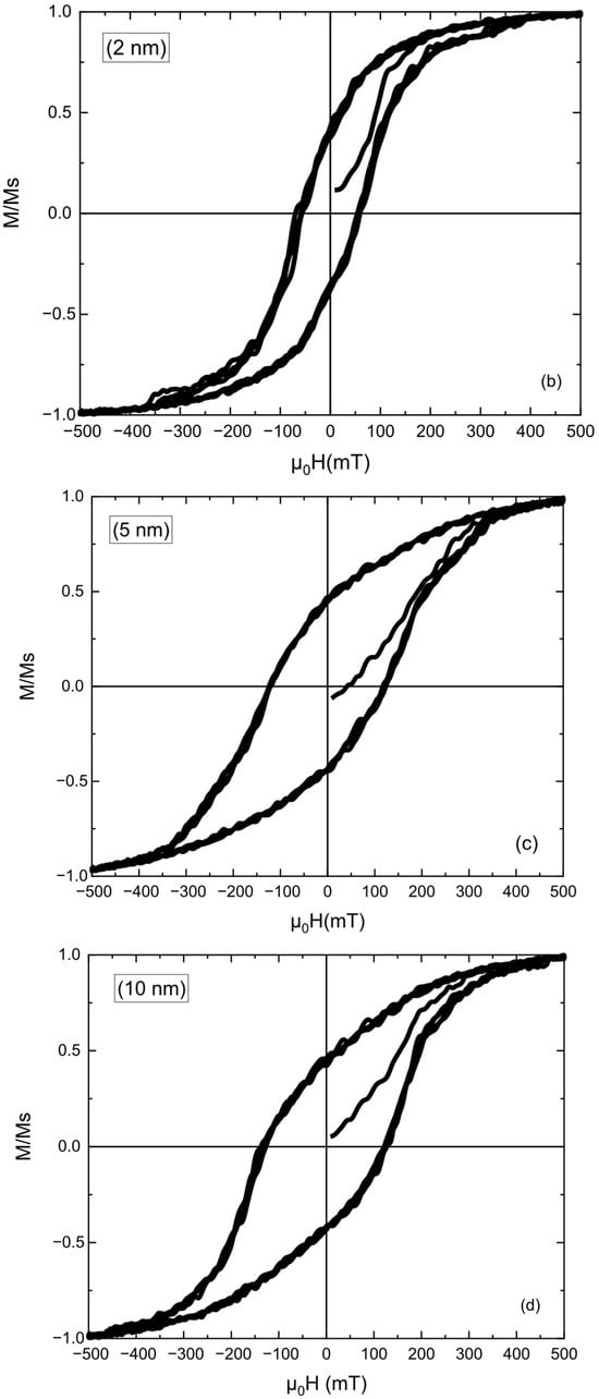 For ultrathin FePt layers, where surface and interface effects dominate, reducing the effective anisotropy and making the magnetization thermally unstable. At 2 nm thickness (Figure 1b), the loop becomes noticeably more vertical in the central region, indicating a sharper magnetization reversal and stronger anisotropic response. The magnetization approaches full saturation within the applied field range, suggesting that the anisotropy and exchange stiffness are sufficient to stabilize a coherent reversal process while maintaining good field response. Although the coercivity is lower than in thicker films, this configuration provides the best balance between switching sharpness and saturation behavior. For 5 nm and 10 nm FePt layers (Figure 1c,d), the hysteresis loops broaden and exhibit gradual, unsaturated magnetization curves, even at ±500 mT. It is important to note here that the apparent small irregularities in all the hysteresis curves arise from discrete magnetization rearrangements in ultrathin, strongly coupled FePt layers.