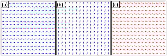 Top-view (xy-plane) of micromagnetic simulation snapshots showing the magnetic moment orientation distribution in the 150 × 150 nm2 film area: (a) positive saturation, (b) demagnetization region, and (c) negative saturation. Arrows represent the magnetic moments onto the x–y plane. In the saturated states (a,c), the moments are uniformly aligned along the applied field direction, while in the demagnetization region (b), the moments display mixed orientations due to partial reversal near the coercive field.