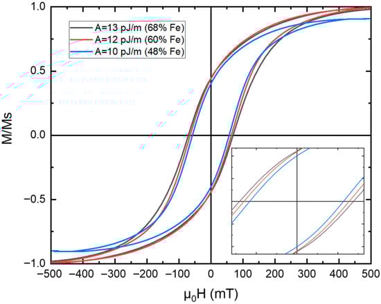 To evaluate how the Fe concentration influences the overall magnetic behavior, three compositions were simulated by adjusting the exchange stiffness constant (), which effectively represents the variation in Fe content within the FePt/Fe alloy system. Based on literature data [50], pJ/m corresponds to approximately 68% Fe, pJ/m to 60% Fe, and pJ/m to 48% Fe.