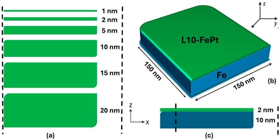 Schematic representation of the simulated thin-film structures: (a) Cross-section image of the various monolayer L10- FePt ultrathin films with in-plane dimensions of 150 × 150 nm2 and thickness varied between 1, 2, 5, 10, 15, and 20 nm. (b) Bilayer structure consisting of an L10-FePt layer and an Fe layer, both with the same in-plane dimensions of 150 × 150 nm2. In the bilayer, the L10-FePt layer is five times thinner than the Fe layer, corresponding to the simulated case L10-FePt 2 nm / Fe 10 nm. The structure L10-FePt 2 nm / Fe 12 nm was also studied. (c) Cross-section sequence of the simulated bilayer structure L10-FePt 2 nm / Fe 10 nm. A reference coordinate frame is included to indicate the x–y plane and film-normal z-direction.