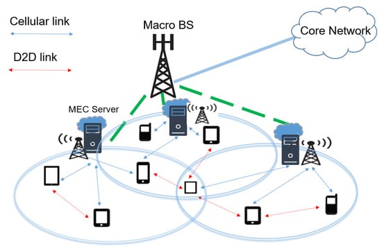We consider a three-layer heterogeneous network with multiple devices and small cells. As illustrated in Figure 1, each small cell has a base station (BS), which could, for instance, be a Wi-Fi access point or a femto cell base station. In addition, each BS is affiliated with an MEC server, e.g., an MEC server could be directly attached to the BS, or the MEC service could be provided to the BS via an edge cloud network architecture []. The devices, which in the 3GPP standardization language are referred to as user equipment nodes, are mobile.