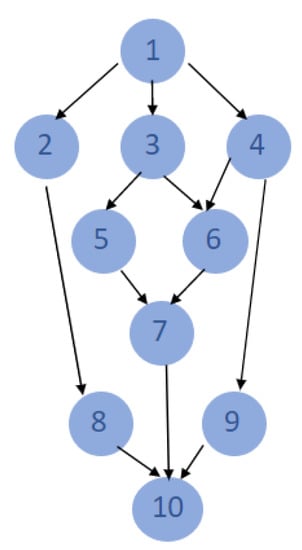 - Start time is the time instant when the execution of task k can commence:whereby the set contains all predecessor tasks of task k. According to Equation (2), the execution of a task k without predecessors () can start immediately, while the start time of a task k that depends on predecessor tasks () equals the maximum finish time of the respective predecessor tasks .