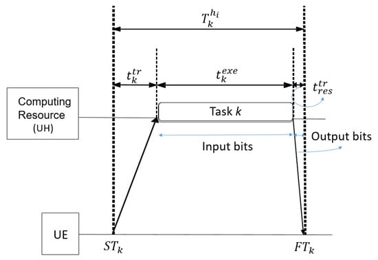 The task execution process by a helper UH consists of two steps. First, the UE transfers task k to the helper UH via D2D communication on the up-link, and then task k is executed by UH. As illustrated in Figure 3, the total execution delay is