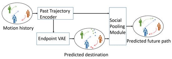 The PECNet system model [], which is illustrated in Figure 4, includes three key elements: a past trajectory encoder, endpoint VAE, and social pooling module. First, a user’s motion histories are encoded via the past trajectory encoder. Then, the result is fed into the endpoint VAE to estimate the user’s destination. Subsequently, the social pooling module uses the encoded past trajectory and the estimated destinations of all users to jointly predict the future path of every user in the scene. The final output are paths whose future segments (i.e., the predictions) are strongly dependent on the past locations (i.e., the inputs).