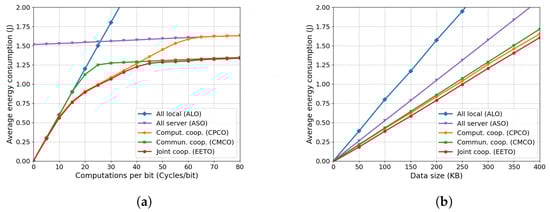where is the data size of task k in bits, denotes the required computational CPU cycles per bit for task k, and is the UE’s CPU cycle frequency allocated to execute task k. Based on Equation (4) and the effective switched capacitance e, which characterizes the chip architecture [], the UE battery energy consumption for local execution can be estimated as