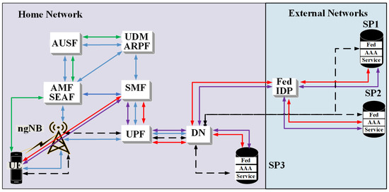 The UE registers to the MNO prior to initial authentication to 5GC via the SEAF controlled AUSF, whereby the user’s subscription data and security context are stored in Unified Data Management (UDM)/Authentication Credential Repository and Processing Function (ARPF) [1,3]. Simultaneously, the MNO registers the UE with SP based on the service agreement and access policies. The MNO and third-party SP also must agree on the security process and parameters such as PKI mechanism, access control policies, identities, authentication, and authorization levels protocols to be used [4]. In addition, the SP registers its services, access control policies, shared secret and keys, SP identity (SPID), and credentials to the IdP. To complete the trust and federated security interoperability the HN registers the UE’s GPSI, user attributes, credentials, and Home Network ID (HNID). This can be managed by an internal or external entity such as the IdP to implement federated security in 5G [7].