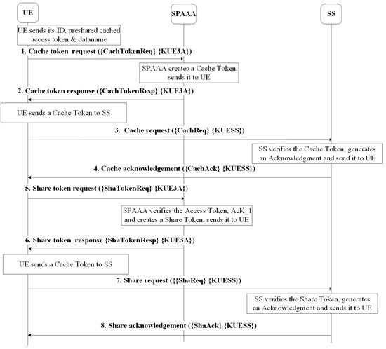 We now give an overview of DCSS protocol execution and message exchange illustrating the protocol’s full execution. It involves the following parties, UE, SPAAA, and SS and consists of cache and share authorization phase. The UE is granted access to the SP services using federated authorization protocol [4], which is when the access token and are generated before. The is a preshared key between the and , the is in possession of the access token before this proposed protocol is run. In addition, the and would also know each other’s ID, public key, and shared session key from the previous message exchange of the authentication and authorization protocol that granted the UE access to the service. The use of signed digested messages is to provide message authenticity, integrity, and non-repudiation. The protocol messages between the parties are illustrated in Figure 3, with reference to notations in Table 2 and described in detail below:
