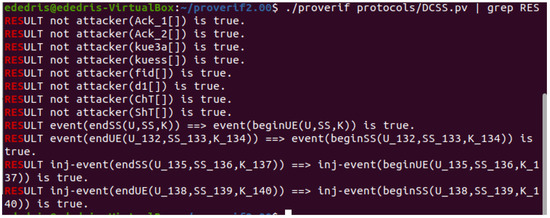After changes were made, the protocol was modelled and run in ProVerif again, there was no attack found as shown in Figure 6, hence the protocol is secure. The ProVerif results indicate that the secrecy of Ack_1, Ack_2, Fid, d1, ChT, ShT holds as shown in Table 4. The authentication events in form of non-injective and injective agreements hold that is query []; event (endSS()) event(beginUE()) is true.