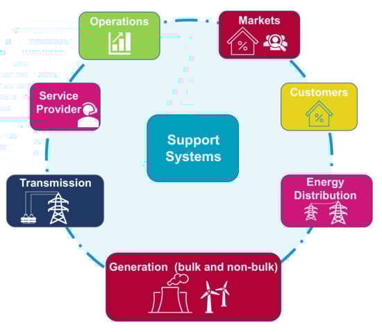 Based on the semantic approach of smart grids, standardization organizations guided by the object-mapping processes have adopted a holistic conceptual model of architecture, which classifies energy networks into seven sub-sectors. Specifically, these sectors are the generation (bulk and non-bulk), distribution, transmission, operation, service providers, customer, and markets. This conceptual approach provides the architectural background for describing and analyzing the interoperability of current standards, as well as for developing new ones. A conceptual representation of smart energy grid architecture based on distinct operating areas is shown in Figure 1.