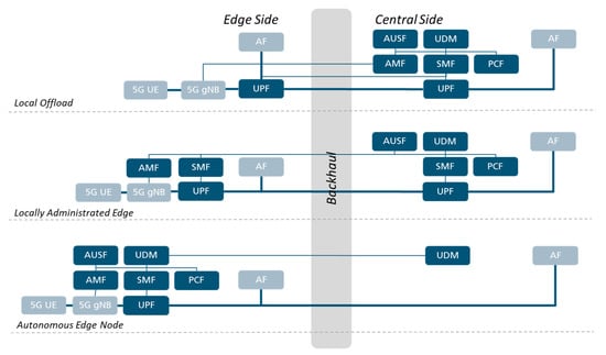 The autonomous edge node deployment model presumes that the edge network is a complete network including all the specific network functions. It could potentially act as a local network, providing connectivity for the devices in the specific area without having the need of a backhaul. To communicate with outside entities, a data network may be deployed immediately from the backend of the autonomous edge. Through it, the data traffic can be forwarded as IP data traffic to the network. Furthermore, there are no options to support a seamless handover to a central network or to another edge as all the dynamic subscriber information is locally maintained.
