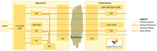 For the local offload split model, the Open5GCore components were split in three virtual machines: one on the edge including the UPF functionality and two on the central server, one including all the components in the control plane and the second one including a UPF for the data traffic connected to the data network.