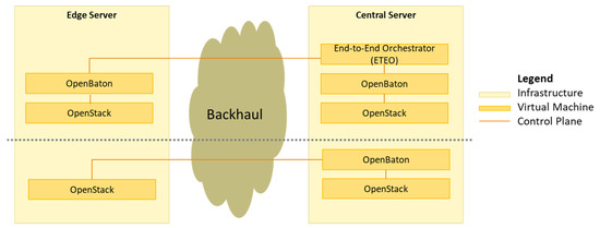 A second setup was also deployed on top of the testbed described. It establishes a direct management of the edge infrastructure following the current ETSI MANO indications. In this setup, only the OpenBaton Orchestrator located at the central network is used which interacts with the two OpenStack installations as it is expected from the interaction between OpenStack and Virtual Infrastructure Managers (VIMs).