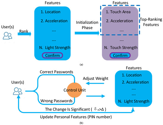 In implicit authentication (IA), the features used for the authentication are predefined by the system, which will not be able to change during the usage [9,10]. To achieve better coverage in user authentication, the existing approaches tend to use multiple features [11,12,13], such as location, touch, and acceleration. However, only a small number of the features (personal features) in the entire feature set are needed for a specific user. Therefore, irrelevant features not only reduce the system’s efficiency, but decrease the authentication accuracy as well. Nevertheless, due to the high complexity of human behavior, it requires a massive calculation to derive personal features, which is infeasible in practice [14]. Hence, finding a suitable scheme that dynamically derives personal features is critical for IA implementation.