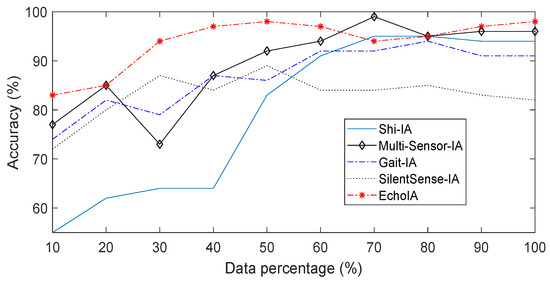EchoIA has the highest authentication accuracy in most of the tests, as shown in Figure 3. Multi-Sensor-IA also has a high authentication accuracy compared to other IA schemes. In the experiment, most of the schemes reach to more than 90% accuracy after using 80% of the data except SilentSense-IA. Note that there are some fluctuations in different IA schemes due to behavior changes, where both Multi-Sensor-IA and Gait-IA have an accuracy drop at the point of 30%. We analyzed the data of Multi-Sensor IA at that point, which shows that most users traveled to different places that did not appear in the training phase. The machine learning model cannot separate users based on the given training data. Since, for some users, the traveling and staying time is non-negligible, it becomes harder for Multi-Sensor IA to make a decision based on the previous training data. After the behavioral data in this new location is collected and stored in training data, the accuracy of Multi-Sensor IA eventually increases and becomes similar to other IA schemes. However, this behavior change does not affect the proposed EchoIA since the system automatically updates users’ personal features during usage. In such a case, the accuracy curve for EchoIA is much smoother than the other schemes. As literature usually does in template updating related research [22,29,30], we measured the EERs and ROCs for EchoIA, Multi-Sensor-IA, Gait-IA, SilentSenseIA, and Shi-IA, which provide more reliable results. The EERs for EchoIA, Shi-IA, Muti-Sensor-IA, Gait-IA, and SilentSense-IA are 0.1428, 0.2200, 0.1635, 0.2700, and 0.2720, respectively; and corresponding AUCs are 0.8991, 0.8588, 0.9244, 0.8103, and 0.8013, respectively.