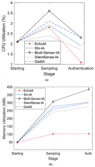 In addition, we evaluated the CPU usage and memory usage for different schemes. In the experiment, we recorded the CPU utilization of different IA schemes at three stages, Start, Sampling, and Authentication. The experiment results are shown in Figure 5a. At the Sampling stage, the CPU utilization of EchoIA is the second-lowest for all five schemes. At the Authentication stage, the CPU utilization of EchoIA is the lowest among all the schemes. Since most of the time the users are at the Authentication stage, the total amount of CPU utilization of EchoIA is the smallest for all the schemes. In the experiment, Multi-Sensor-IA has the highest CPU utilization, but it also has a high authentication accuracy similar to EchoIA.