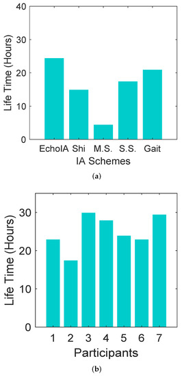 We also calculated the average battery lifetime of each participant by using EchoIA. Figure 6b shows the battery lifetime derived from the data of seven different participants. They are randomly selected. We calculated an average battery lifetime across all participants’ data for comparison purposes, which is 23 h. There are large differences in the battery utilization between users. As shown in the figure, participant 2 has the shortest battery lifetime, which is 16 h. Participant 7, however, has the longest battery lifetime, which is 30 h.