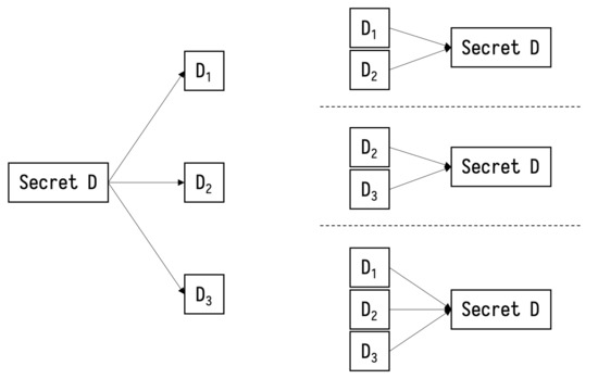 - Shamir, A. How to share a secret. Commun. ACM 1979, 22, 612–613. [Google Scholar] [CrossRef]