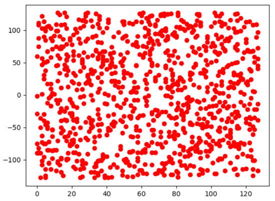 In cryptography, confusion and diffusion are two critical properties in the processing of secure cipher [29], and diffusion indicates the connection between the plaintext and ciphertext. In our design, the distribution of generated random numbers should have no obvious connection with any data point given by the nodes in the blockchain network. To show the randomness of the generated random data points and scattered distribution, we simulate the distribution using several rounds of polynomial interpolation of degree 1000 and plot all rounds’ data points in the coordinate plane. As shown in Figure 2, the red dots represent the data points in 1000 rounds of polynomial interpolation. We can see that there is no obvious pattern, which shows the randomness of k data points selection and the fairness of dealer selection.