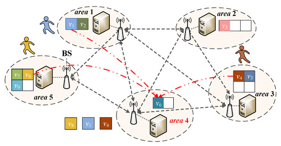 For each service, the decisions are made depending on the observation of the environment from their own perspectives during each episode. However, there is no prior knowledge of the mobile edge computing system, which means the data size and trajectories are unknown to each server. Thus, the process is online and model-free. In order to maintain the service performance, the migration of services and users’ activities are tightly coupled. Since the multiple users move erratically and autonomously, there will be a conflict between multiple services due to similar or overlapping users’ trajectories during the learning process. We use the following example to illustrate this problem, which is shown in Figure 3. Suppose that the activities of users , , and are all around area 4 (written in red text) at the same time slot. In this case, the chosen services have a high probability of migrating to the same edge server in the learning framework. However, the rest of the storage can only afford one service, which creates a migration conflict.
