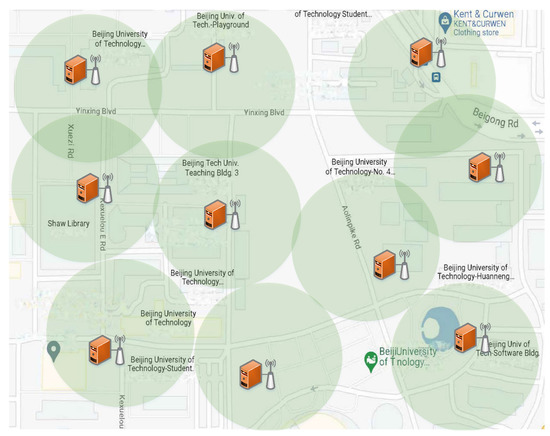 Our prototype is built on a workstation Precision T7910 with Intel Xeon(R) E5-2620 CPU, NVIDIA RTX5000 GPU, 128 Gb memory, and a 2Tb hard disk, which runs a Linux operating system using python. We simulate our edge computing architecture based on the campus of Beijing University of Technology with a range of m and set up 10 mobile edge servers in synthetic datasets, as shown in Figure 4. For each server, the setting of computing capacity randomly ranges from 20 to 25 GHz. The storage of each server ranges from 8 to 16 GB, and the bandwidth between each pair of edge servers is GHz. We set the transmission power to be W and the noise power to be [24]. In order to analyze the total delay with different numbers of users, we construct the synthetic dataset into three groups of size 20, 30, and 40. The data size of uninterrupted requests sent by users in a continuous timescale randomizes in [0.1 GB, 0.5 GB]. The settings of hyperparameters are listed in Table 2. In addition to the proposed placement algorithm, two state-of-the-art algorithms are used: dynamic service placement with no migration (DSP-NM) and dynamic service placement with all migration (DSP-AM).