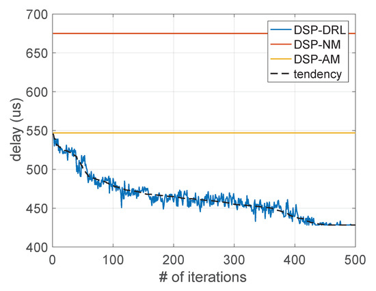 We investigate the convergence for three groups of mobile users (of size 20, 30, and 40), and where each user has 20 trajectories in a timescale. The results are shown in Figure 5, Figure 6 and Figure 7. We use a black dotted line to describe the convergence trend of delay with the increasing number of iterations for each group of users. Additionally, we have the following observations. (i) For the same group of users with the same trajectory, the delay of users guided by the DSP-DRL framework is far greater than the other two comparison algorithms. As shown in Figure 5, the red and yellow lines are the results of DSP-NM and DSP-AM, which are much higher than the beginning of DSP-DRL. The relationship between the results of DSP-NM and DSP-AM is influenced by the communication delay and the migration delay, which relates to the size of users’ data and the configuration files of services. In our experiment, the users are set to send data packets uninterrupted at equal time intervals. Therefore, the communication delay increases sharply when the users move frequently, resulting in a very large delay under DSP-NM. (ii) The increasing number of users has an influence on the convergence. As shown in Figure 5, Figure 6 and Figure 7, the speed of the convergence slows down as the number of users increases. As shown in Figure 5, the total delay is close to convergence after 250 iterations. However, as shown in Figure 6 and Figure 7, the groups with 30 and 40 users approach convergence after 400 and 420 iterations. The reason is that an increase in the number of users means a corresponding scaling in the number of services, and the probability of the migration conflict will increase, which reduces the convergence speed. (iii) The total delay fluctuates within a relatively fixed range for each group of users. Since the provisioning of edge servers is relatively dense, there exist many cross-coverage areas that provide multiple choices for users. There are many different placement results in the learning process of DSP-DRL, and the total delay generated by these results will fluctuate among several relatively fixed values during the convergence process. Therefore, the fluctuations are different under these three groups of users, which is related to the user’s activity trajectories and the placement deviation of services.