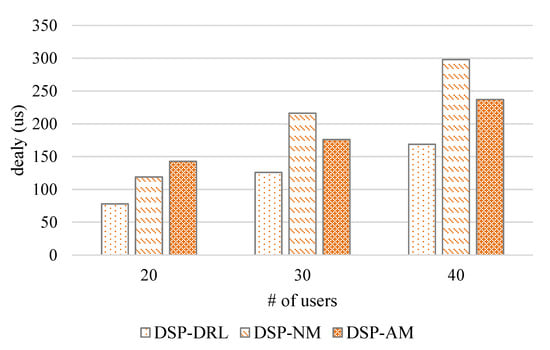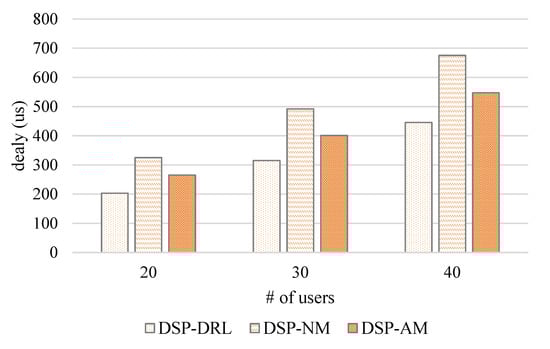 According to the convergence obtained with different groups of users, we assess the average of the delay among the three groups, which are shown in Figure 8 and Figure 9. Additionally, we have the following observations. (i) The number of users’ activity trajectories collected in a timescale affects the total delay. As shown in Figure 9, the highest total delay of 40 users under DSP-NM in the case of 10 trajectories is much lower than the case of 20 trajectories. (ii) The erratic activities of end-users make the delay under these three algorithms quite different. For the users with 10 trajectories, the total delay of 20 users with DSP-NM is lower than DSP-AM. However, for groups with 30 and 40 users, the total delay of DSP-NM is higher than that of DSP-AM. For the users with 20 trajectories, the total delays under the DSP-NM of these three groups of users are all higher than DSP-AM. For both cases, DSP-DRL is always able to obtain a lower latency for different numbers of users. Compared with DSP-NM and DSP-AM, DSP-DRL can reduce the total delay by 41.2% and 32.9% under the constraints in the 10 trajectories case and 35.4% and 20.5% in the 20 trajectories case. In summary, DSP-DRL has better performance across different scales of users in mobile edge computing.