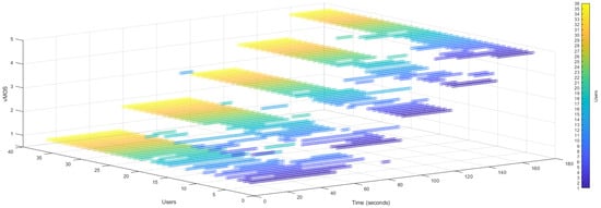 Figure 4, Figure 5, Figure 6 and Figure 7 show the bit rate downloading, resolution, dropped frames, and buffer length. Figure 8 shows the vMOS of the users on a 3D scatter plot where the X-Axis shows the time frame, the Y-Axis shows the users who participated, and the Z-Axis shows the MOS ratings. This figure explains the number of recorded responses, and we can see the direct relation of the network features to the MOS and the time frame of uploading. It seems that the data present a logical front of an increase in performance that directly leads to an increase in vMOS for the quality preserved by the users. These figures conclude that our chosen features directly satisfy our data generation for training-ready data as they show a linear increase in QoE as the network feature abilities are less restricted.