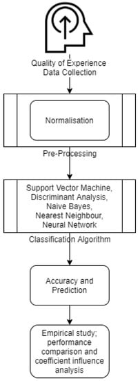Furthermore, a data analysing process had to happen on two different levels after obtaining raw data from the virtual test bed and the vMOS from the users. QoE scoring factors and network data had to go through data cleaning and normalisation. Then, the features stated before were placed through a training process against the MOS and vice versa to make a collection of classification predictions and use a neural network to compare and contrast them. All features were trained with fine tree, medium tree, coarse tree, kernel naive Bayes, linear SVM, quadratic SVM, cubic SVM, fine Gaussian SVM, medium gaussian SVM, fine KNN, medium KNN, coarse KNN, cosine KNN, cubic KNN, weighted KNN, boosted trees, bagged trees, subspace discriminant, subspace KNN and RUSBoosted trees. With no over-trained attempts, which model is best fitted for the data and the feature classified [22] by comparing and contrasting. Figure 9 shows an example of the data analysis process.