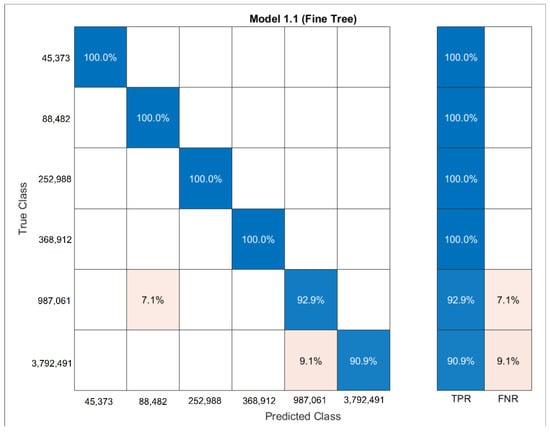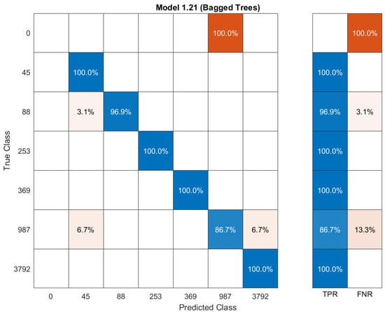 In Table 8, all classification methods mentioned above are used to classify the five features and predict their outcome if a new stream of data is inserted. The table shows the percentage of the predicted class against true class. From these models, the researcher selected the models with the highest accuracy along with the fastest prediction time. Bagged trees was selected for bit rate downloading and MOS and fine KNN for the buffer length, the dropped frames and the resolution. Table 9 shows the most ideal machine learning classification prediction methods on highly noisy data, such as our generated network data and MOS user feedback technique proposed in our previous paper [22]. It is important here to discuss the prediction speed along with the training time for the prediction of MOS. The training time, prediction speed and misclassification cost columns are representations of the different machine learning classifications to predict MOS. The highest accuracy using bagged trees resulted in 10.69 s with 1200 observations processed per second. This is a good presentation to see in the live test bed.