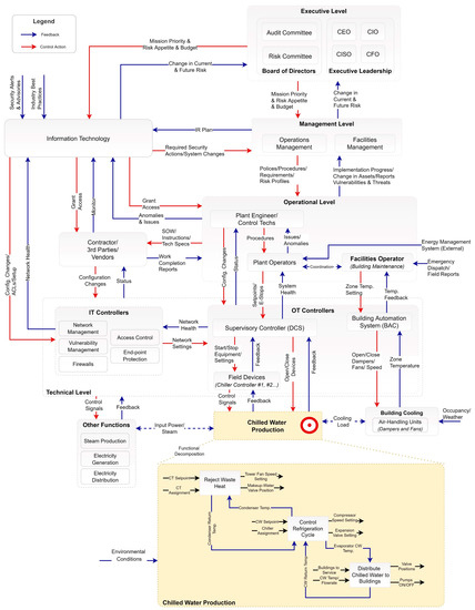 One of the key aspects of the Cybersafety method is understanding the control structure that enforces constraints on the system to prevent it from moving into unsafe/insecure states. Figure 3 represents the functional control structure for the chiller plant; here a hierarchy of controllers are shown where each controller has a function along with certain safety and security-related responsibilities. The controllers fulfill their responsibilities by taking control actions based on some feedback with the goal of keeping the chiller plant safe.