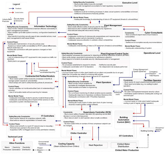 So far, we explored loss scenarios for two unsafe/insecure control actions. The same approach would be repeated for each of the other controllers. Figure 5 provides a summary of safety/security constraints, control flaws, process/mental model flaws for each of the controllers. This provides a holistic, systems-view of the various flaws in assumptions and controls at the chiller plant that can ultimately lead to security incidents.