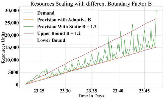 A general gradual increase in the requested demand is depicted in Figure 4, where the Upper Bound represents the sum of the demand and boundary (), and the Lower Bound is equal to the actual demand. Note that in Figure 4, the curve for the Lower Bound is the same as the demand curve. The best provisioning value is the provision line that has a value close to the demand and a variable base value, B, as it is clear that the demand was small in the beginning and the boundary value was ; however, with higher demand values . The value of B must be reasonable with respect to the demanded resources provisioned, such that it is as close as possible to the demand. On the other hand, fixing the B value as a small constant factor will cause many provisioning problems because the configuration time and resource preparation has a relationship with the total demand. The value of B must dynamically change as the demand increases. In Figure 4, the machine’s contribution in the provisioning process for a static B is derived from the real trace cases, which means the amount of resources released must achieve the requested demand with good performance. For provisioning with an adaptive B, a machine list is dynamically rearranged, and the best resources are chosen. A rational derivation for B values is to correlate the minimum and maximum demand values during a time interval () with respect to the maximum and minimum provisioned values (). The relationship is derived by finding the minimum value of the normalized averaged of the minimum demand and what was provisioned and the normalized average of the maximum demand and what was provisioned during the time window (). The final boundary value is described in Equation (1) for each time window.