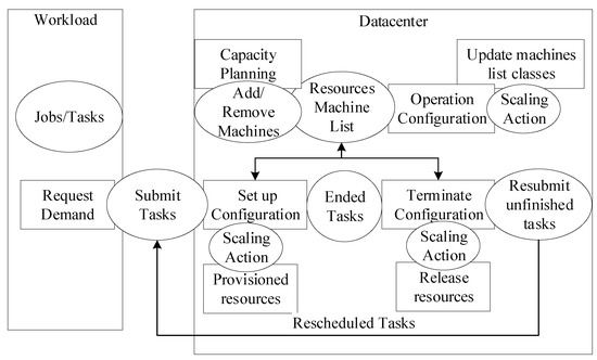 A complete model for data center behavior and workload demand is presented in this section using two methods. The first method uses analytical and statistical probability to describe data center provisioning and workload demands. The second method uses deep machine learning by correlating the input and output behavior of the system. Figure 7 shows the general architecture of workload demands and the data center with its internal modules. Workload demands are described by bunches of jobs that include tasks submitted to the data center queue (the Submit Tasks ellipse in Figure 7). Data center resources (Resources Machine List) are configured on the fly to match the requested demands in an elastic way by increasing or decreasing the provisioned resources. The system receives submitted jobs/tasks as a script file descriptor, which specifies the needed resources, similar to HPC job submission. The submitted tasks module acts as a proxy to communicate with the resources scheduler that masters the resource reconfiguration and assigns tasks to computational nodes with proper reconfiguration. The machine list is updated by the data center capacity planning, which is the total resource capability. The data center is scaled all the time by adding new servers or removing failed machines. The operation configuration works with the scaling action to determine the direction and reflect it in the machine classes. The machine list is also updated by the setup configuration, which works to accommodate new tasks and by the terminate configuration, which works to release the resources from terminated or failed tasks. The failed tasks will be resubmitted by en-queuing them in the Submit Tasks. The two models must represent the whole architecture accurately that will be used to validate and test our proposed optimized machine learning elastic model.
