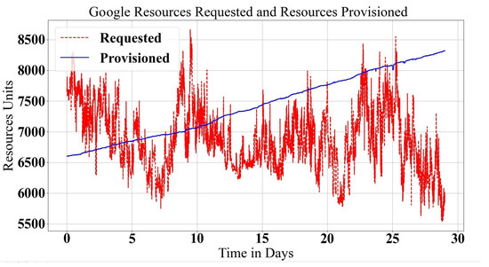 Submitted tasks are served by cloud resources that are provisioned in response to demands and released once these jobs and tasks end. For Alibaba, the equivalent of a task is an instance. Each submitted job j includes a batch of tasks , where one task requires a vector of infrastructure resource demands . Provisioned and de-provisioned data center resources are counted in resource unit of task i in job j. For tasks that have ended, is the released resource vector of integer index i.