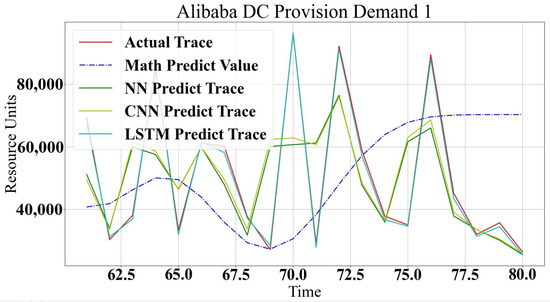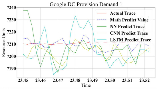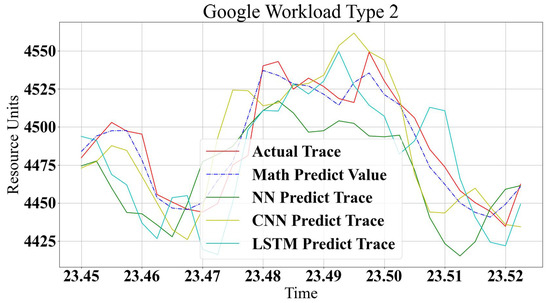 The proposed models are implemented using Python 3.7.8, Numpy library version 1.19.5 and Google tensorflow 2.4.1. The analytical model is built based on the Google Log traces and has been used to test the machine learning model. Google trace describes the demands of jobs and tasks as in the workload modeling. The resource demands do not follow one type of characteristic. Two workload types are used to test the proposed modeling methods. Figure 10 and Figure 11 show a comparison between the three machine learning models’ prediction accuracy compared to the analytical method. It is clear that all methods show good prediction values with minor deviations. The analytical approach shows closer predicted values to the real trace, especially in a trace that changes quickly, such as in Figure 11. However, Figure 10 shows that ML methods are closer to a real trace. Overall, all methods show good accuracy for all types of workloads, with some variation in the prediction accuracy. This is according to logs and modeling characteristics. In non-repeated logs, it is noted that LSTM strangles rapidly predicted non-periodic changes in traces, but, on the other hand, it is a very accurate prediction scheme for similar rhythmic logs. CNN is excellent for most cases but shows a shortage in small changes predictions. NN can be more generic for all types of logs and behavior schemes without any preferable accuracy for any type of workload.