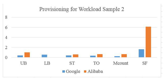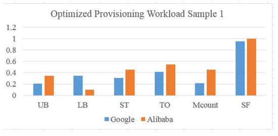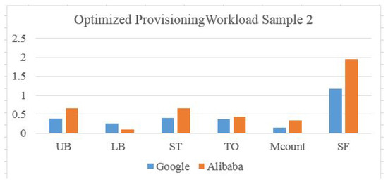 Elastic scaling in this context concerns data center resource reconfiguration by minimizing rapid hardware changes and matching demands by populating an accurate machines list. By applying these metrics to Google and Alibaba scaling using the real trace, and normalizing the values to the max value, the training input of the trace is represented as a percentage. It is clear that in Figure 16 and Figure 17, the Alibaba scaling factor is very high (6 to 7 times the demand), which means resources are being wasted. The Upper Bound value is also normalized to be a percentage. For Google trace, values are 0.85 and 1.611, which means violation is higher (0.78) in workload type 1 than (0.565) in workload type 2. Machine count represents machine participation in provisioning for that sample. Normalized to a maximum number of available machines, represents the number of machine transitions normalized to the maximum movements in a Bayesian network. For both Alibaba and Google traces, is higher than because one machine can jump between states more than one time. For Alibaba, most of the machines are participating in the provisioned resources from the service starting point, which increases the and factors. However, for Google, resources are added gradually, which increases the ratios and reduces costs. Further, the cloud manager needs more time to check the higher number of machines.