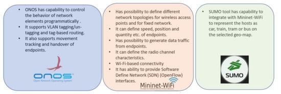 Based on the requirements considered above, the Open Network Operating System (ONOS) SDN controller [17] is selected to programmatically control the network topology, and Mininet–WiFi [18] is selected to define the network topology. The tool SUMO [19] is considered for the graphical representation of the selected scenario. Figure 1 shows the selected tools with their key properties that are considered to emulate the railway and road coexistence scenarios.