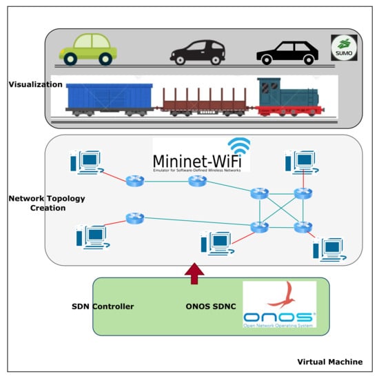 Figure 2 represents the test setup overview. All the selected tools that are considered to emulate the railway and road coexistence scenarios are installed on a virtual machine. The considered network topology is created using Mininet–WiFi for road and railway coexistence scenarios. To control the functionality of the network topology, an SDN application is developed, installed, and activated for the ONOS SDN controller. The SDN application is developed to support the moving of end nodes and the inter-cell handover of created nodes in a defined virtual space. It also has the ability to differentiate the data traffic based on VLAN tagging. Detailed information about this developed SDN application is elaborated in Section 8. SUMO is integrated with Mininet–WiFi to graphically represents the movement of network nodes on an open street map.