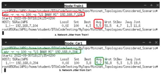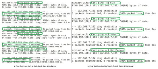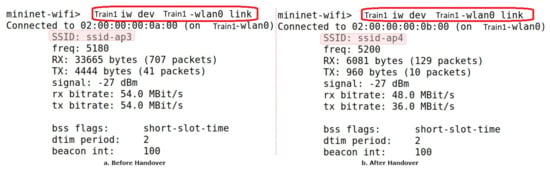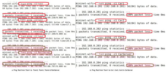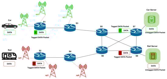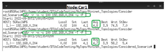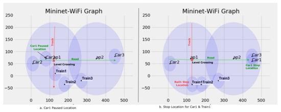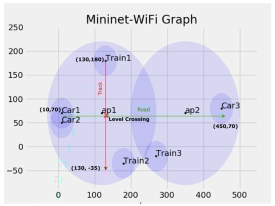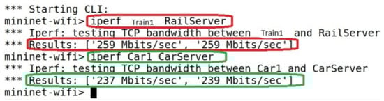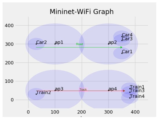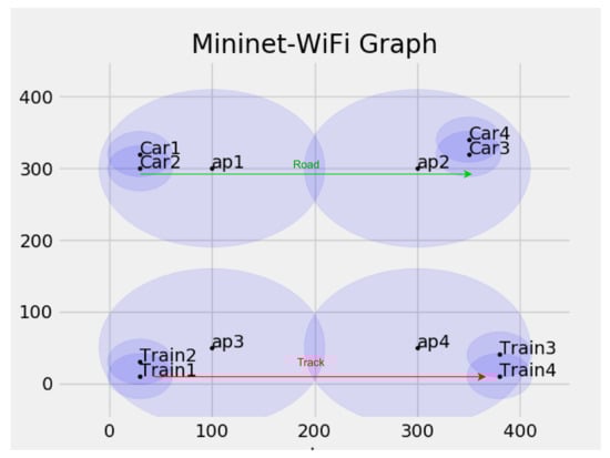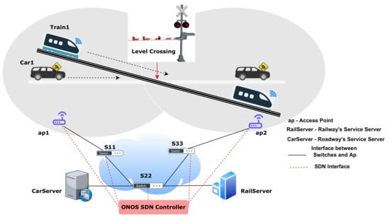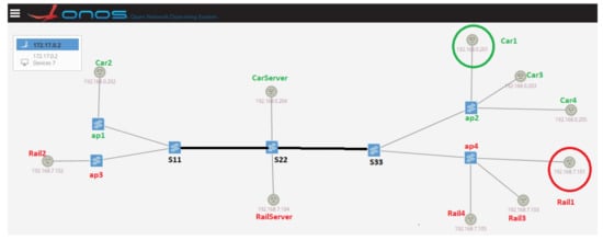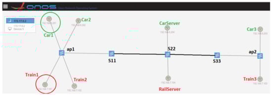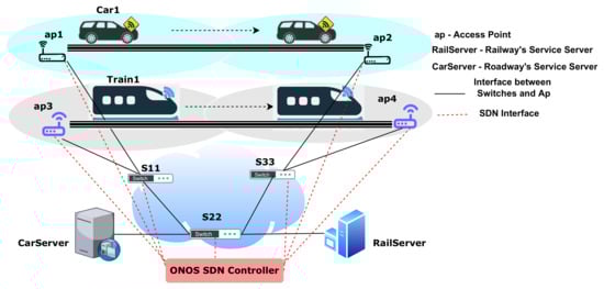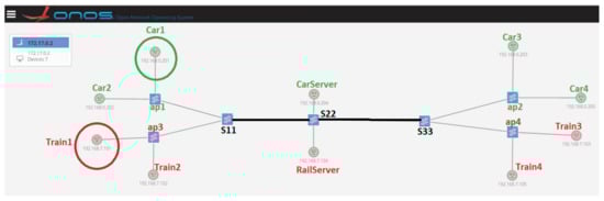 A Python script is written to create a network topology with Mininet–WiFi where trains and cars have different access networks, both domains shared the core network, and railways have parallel tracks to roads. Figure 3 shows the S2(5/6)1 scenario, where an ONOS SDN controller programmatically controls the forwarding elements of the topology. The network switches and access points are SDN-based devices and they are operated and controlled via OpenFlow protocol. Host Car1 represents a car, and host Train1 represents a rail. Access points ap1 and ap2 are defined for roads, and ap3 and ap4 are defined for railways. Access points ap1 and ap3 are connected to network switch S11, and ap2 and ap4 are connected to switch S33. The switch S22 is connected to S11 and S33. The host “RailServer” is defined as a railways service server, and “CarServer” is defined as a road service server; both servers are connected to switch S22. In this simple network topology, switch S22 is the core network switch, and S11 and S33 are the edge switches.