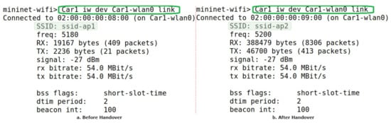 In this section, some previously executed research and findings are given. In [9], the authors Mininet–WiFi to compare flow-based monitoring mechanisms for the Internet of Vehicles (IoV) environment. Performance comparison of open-source SDN controllers is presented in [10] to investigate the end-to-end delay for SDN-based vehicular networks. The authors in [11] developed a network prototype to define a car as a node with Mininet–WiFi to emulate the vehicular networks. The authors in [8] demonstrated the emulation of software-defined wireless networks using Mininet–WiFi. An emulation framework is presented using Mininet–WiFi in [12] for connected autonomous vehicles. A detailed survey for connected vehicles is presented in [13]. In the paper [14], the authors investigated the handover mechanism for communication at the intersection of the coverage range of the cells for vehicular networks. They introduced multiple-access edge computing (MEC) with a roadside unit (RSU) based on SDN to improve the handover process and curtail the handover time. In paper [15], the authors used a simulation tool known as Mininet–IoT with a Ryu–SDN controller to create a vehicular ad hoc network (VANET). They also introduced a new interface based on the global positioning system (GPS) for cars to establish communication between cars when they are not in the coverage range of access points. This proposed system has better throughput and lower delay compared to WiFi–VANET. In [16], the authors emulated the 5G-NR for the vehicular network using Mininet–WiFi-Containernet and SUMO tools.