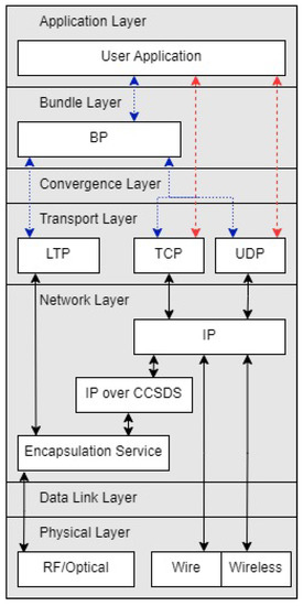 Bundle Protocol network stack. Blue dotted lines show OSI model layer 4 and up for a typical DTN network stack. Red dashed lines show the typical layer 4 and up for Earth communications (without BP). Black solid lines show the underlying network layers.