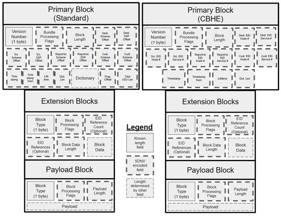 Introduced four years after the BPv6 specification, Compressed Bundle Header Encoding (CBHE) is a mechanism to further preserve bandwidth, by avoiding encoding EID dictionaries entirely [21]. In a situation that meets the requirements for CBHE, encoding a dictionary can be skipped, with EID information encoded as ipn scheme (ipn is one of the URI schemes used to encode EIDs) EIDs in the primary block’s source EID, destination EID, report-to EID, and custody EID offset field. With CBHE, bundles can be transmitted without a dictionary, and the dictionary can then be rebuilt at the receiving node. Figure 3 provides a general diagram of two layouts of BPv6 bundles: a standard bundle, and a bundle using CBHE. Here one can view the Extension and Payload blocks are the same but the Primary block of CBHE removes the dictionary and its counterparts. BPv6 CBHE format was used for the experimentation portion in this paper.