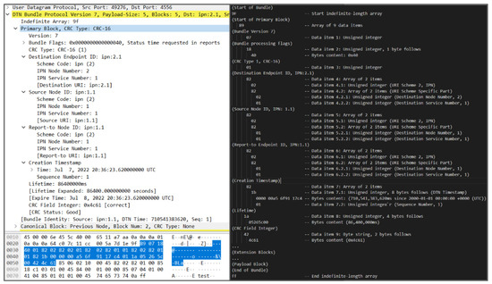 Decoding of BPv7 bundle (left: Wireshark capture of BPv7 bundle with primary block bytes highlighted; right: A manual decoding of the CBOR-encoded bundle fields).