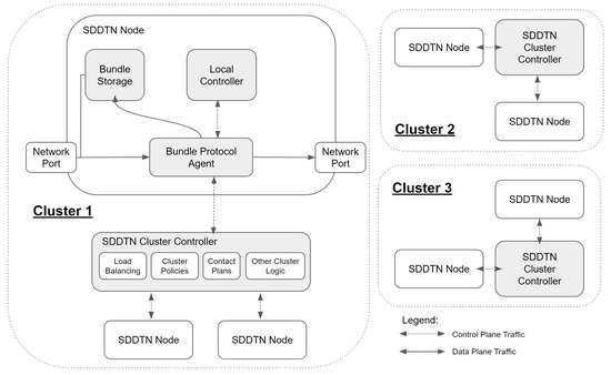 A Software-Defined Delay Tolerant Network architecture, with three clusters, each containing an SDDTN controller managing SDDTN nodes via control plane links. A SDDTN node has all the behaviors of a typical DTN node, dictated by the abstract Bundle Protocol Agent, and also has communication with a local controller.