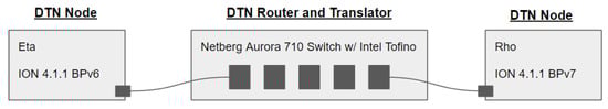 The configuration involved two endpoint computers, named Rho and Eta, connected to hardware ports on the Aurora 710 switch. Rho and Eta acted as DTN nodes generating or receiving bundles to be sent to its counterpart over UDP, IP, and Ethernet. Version 4.1.1 of the ION software implementation of DTN was installed on both endpoint nodes, which supports both BPv6 and BPv7 (configured respectively in installation). ION was chosen for development as it offers an application called bpchat, a command-line interface (CLI) chat function, which enabled quick confirmation of different bundle payloads. Figure 7 shows the setup, where the two DTN nodes, each running different versions of BP, are connected to the programmable switch.